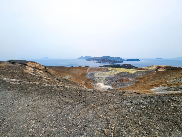 The last stretch circles the rim, where steam seeps from vents and the view opens to the whole Aeolian chain — Lipari below, Stromboli in the distance, the sea shining like molten glass.